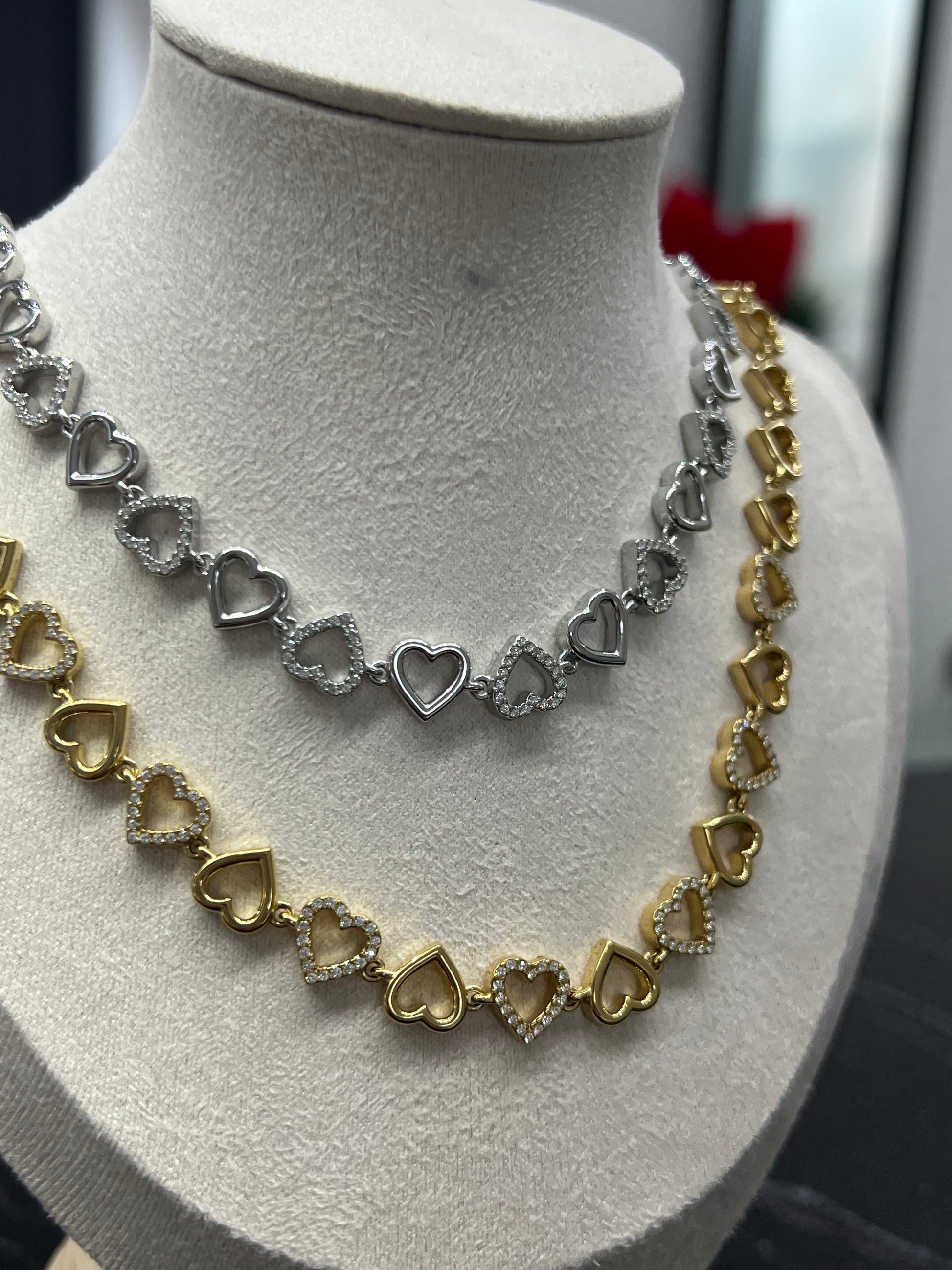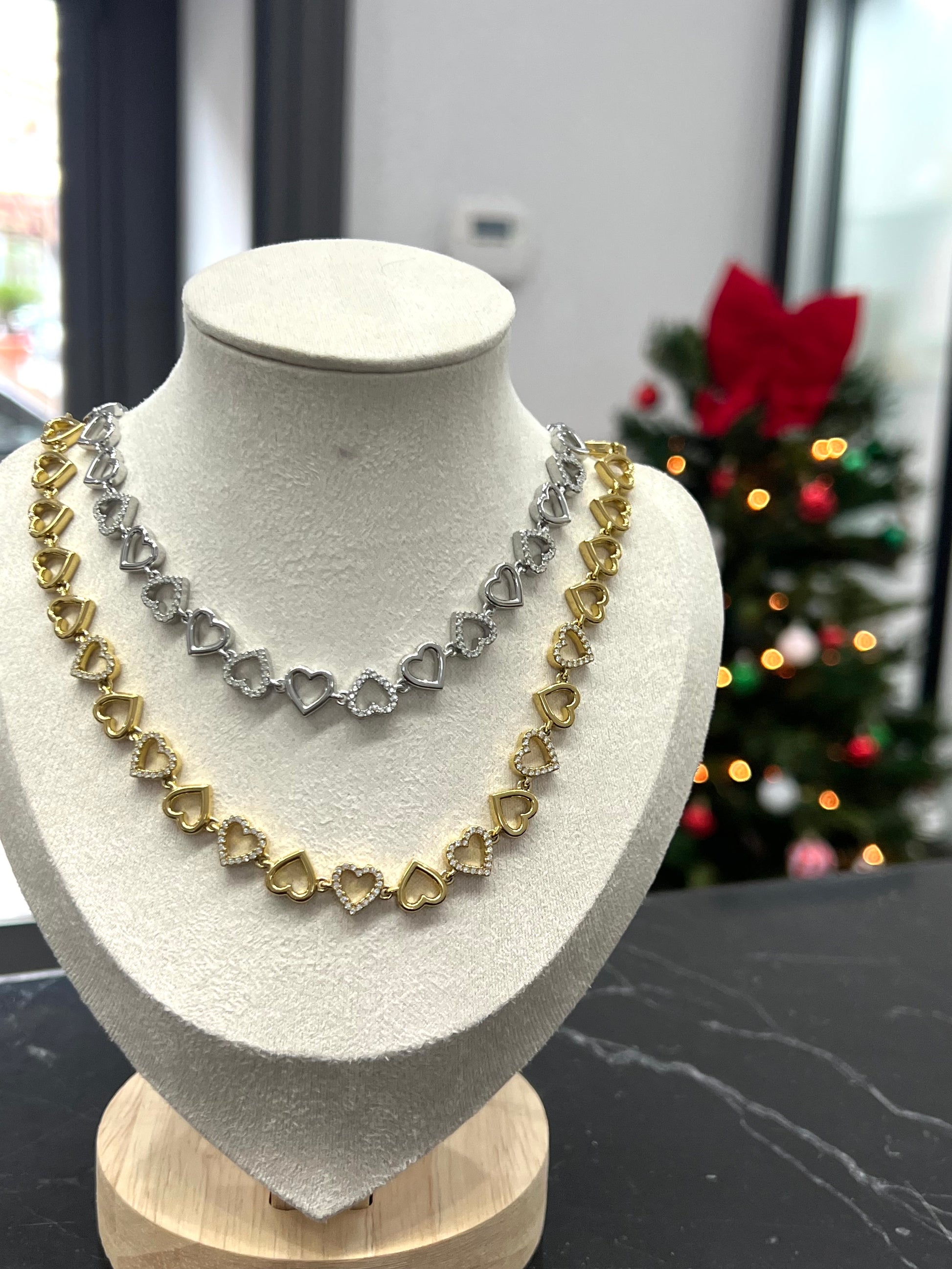Collana in acciaio inossidabile con cuoricini lisci e cuoricini con strass